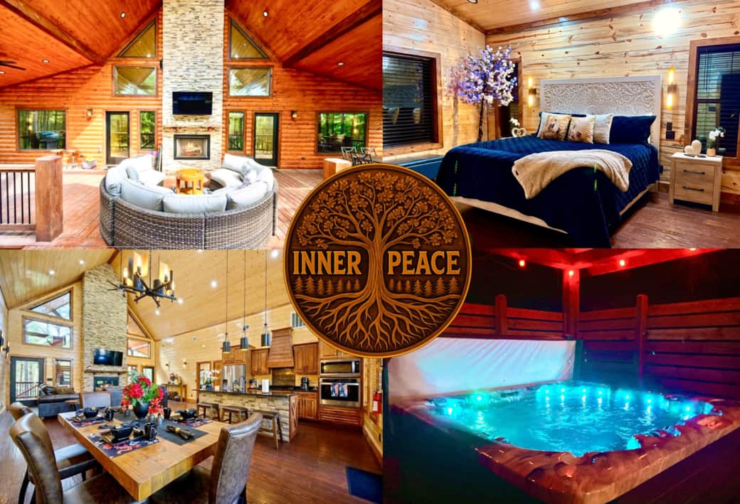 Inner Peace cabin is the ultimate escape destination with luxury in mind. From luxurious bedding in master suites to spacious elevated deck, top quality furniture, and oversized hot tub surrounded by ambiance lighting. During the daytime you can enjoy peaceful nature all around grilling up your favorite meal. At night it is your ultimate entertainment destination soaking in the hot tub watching TV outside, or gathering by campfire . The experience is unforgettable.